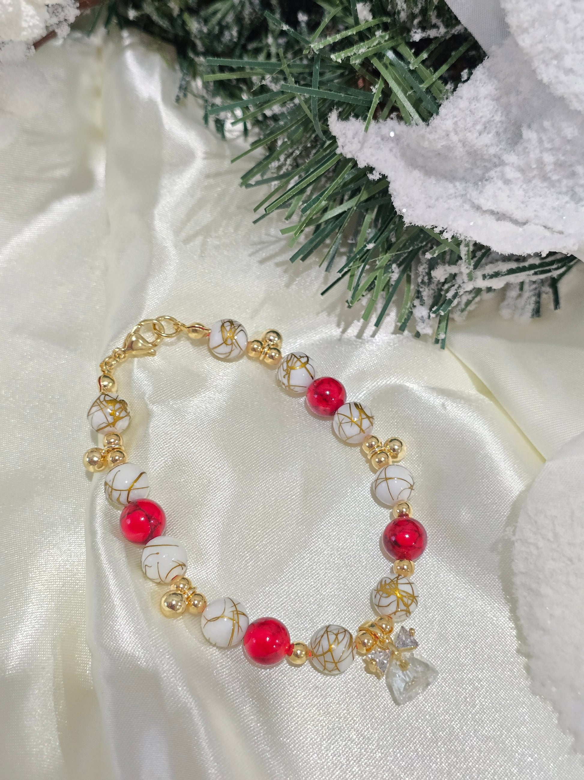 A bracelet that blends elegant white stones with golden veins and deep red beads, creating a festive and sophisticated contrast. The faceted crystal bell charm symbolizes holiday joy and family togetherness, making it a truly meaningful piece for the season.