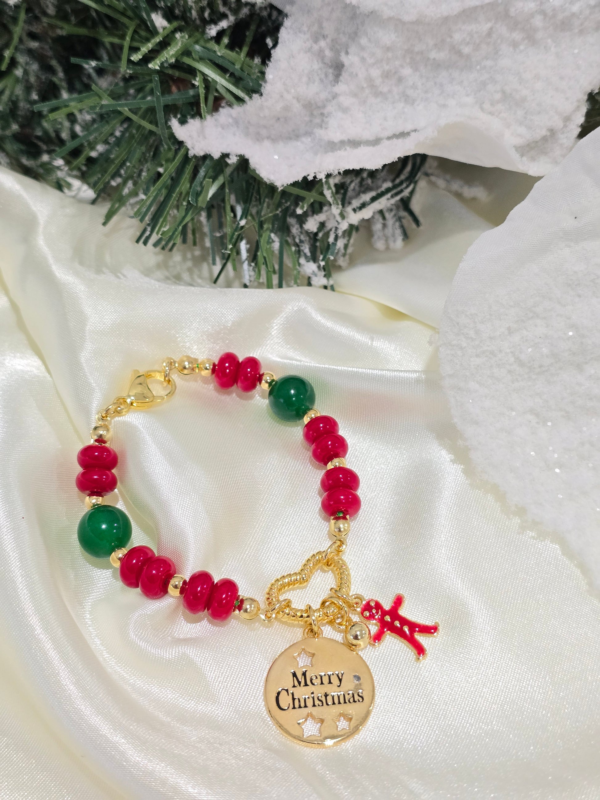 This bracelet brings together the most iconic Christmas colors: vibrant red jasper and deep green jade. Decorated with a Merry Christmas engraved medallion and a playful enamel gingerbread man charm, it’s the perfect piece to celebrate with style and joy.
