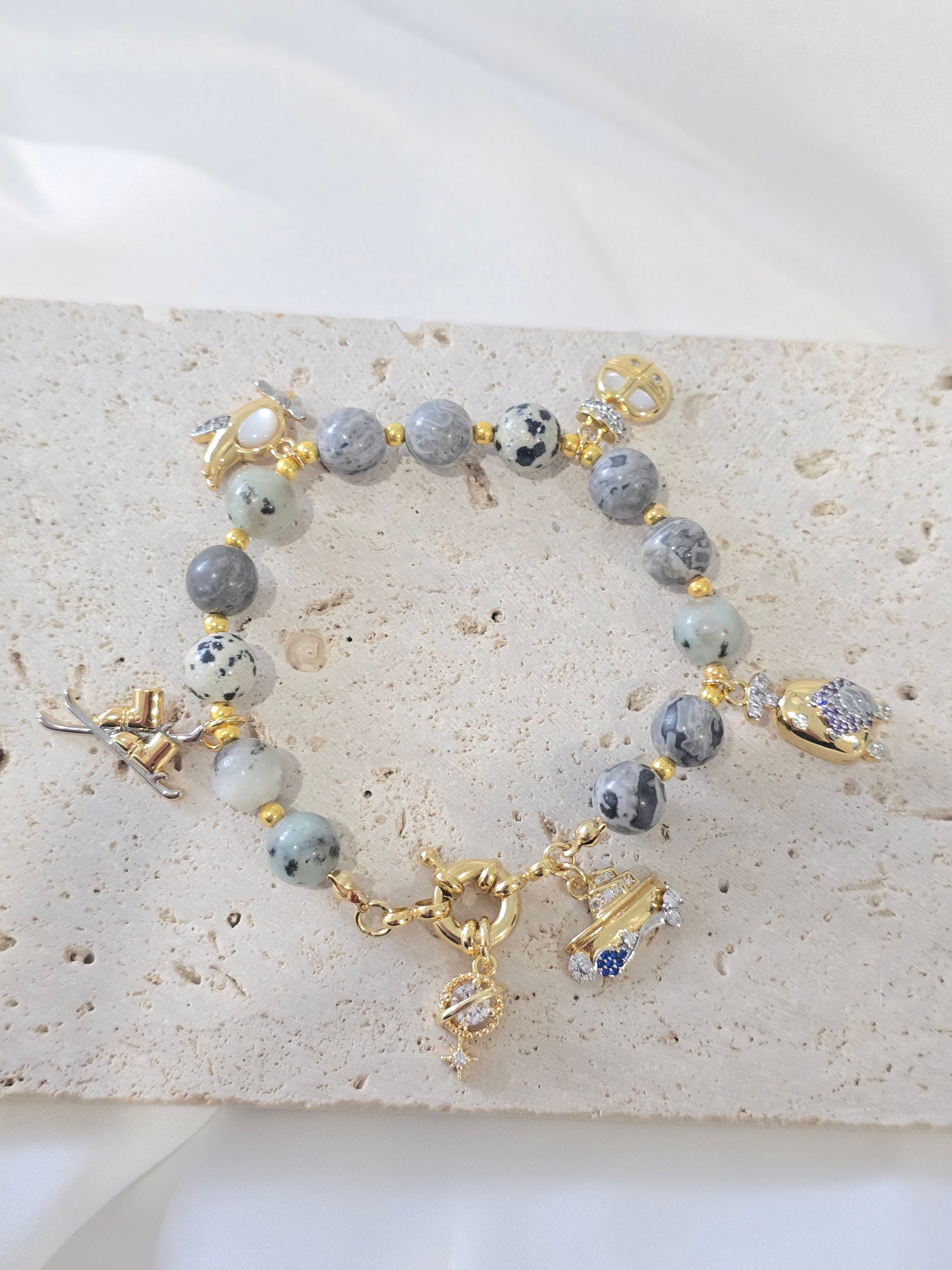 Made with natural gray stones symbolizing wisdom and grounding energy, it features six symbolic gold-plated charms: